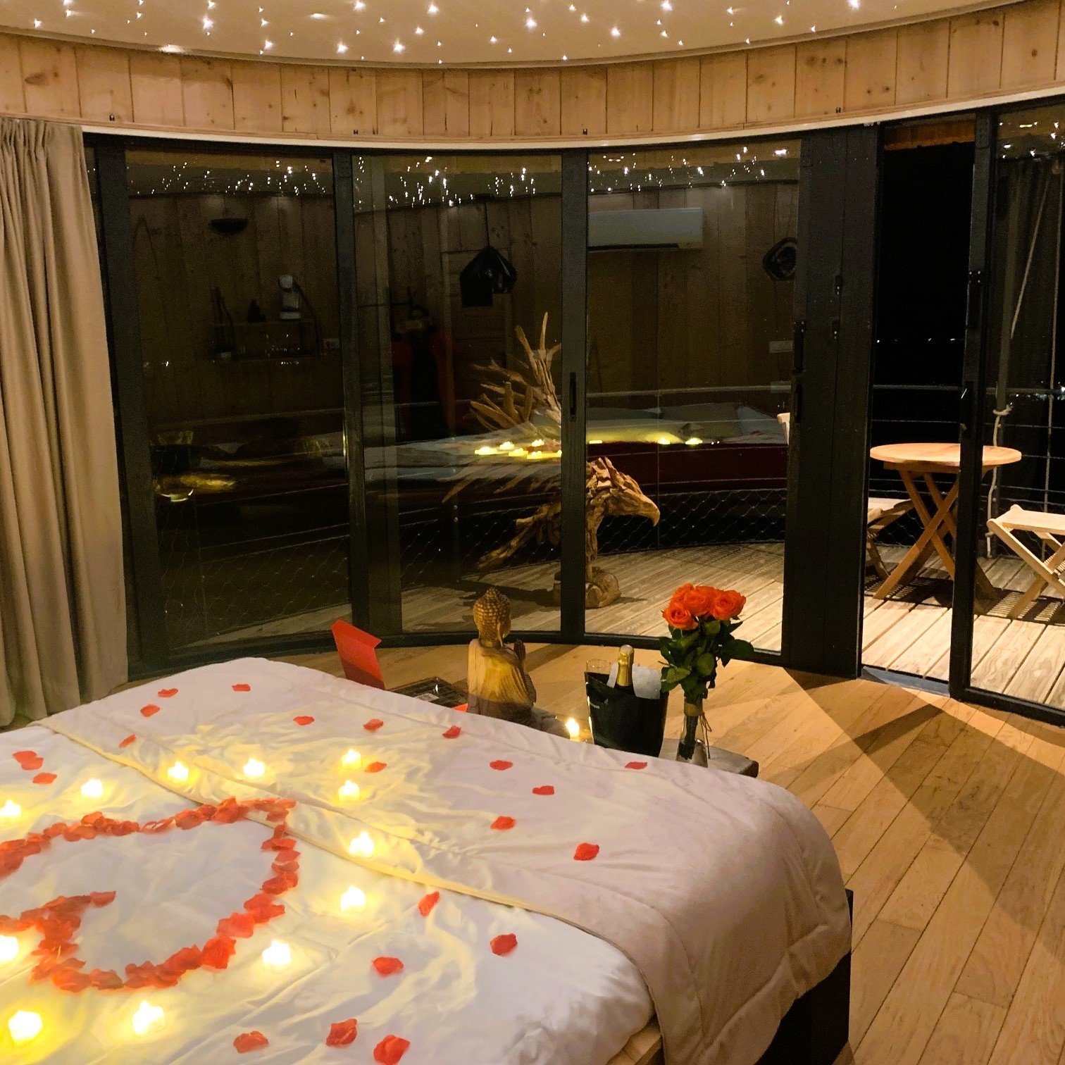 Le Lodge Spa Prestige est une évasion paradisiaque pour ceux qui souhaitent allier le luxe au contact direct avec la nature. Situé dans le magnifique Domaine des Étoiles, ce lodge entièrement en bois se distingue par sa baie vitrée circulaire qui offre une vue panoramique sans pareil. Conçu pour deux personnes, ce lodge est une invitation à la relaxation, avec un espace intérieur pensé pour le confort et l'intimité. Le mobilier haut de gamme et les équipements modernes s'harmonisent dans une esthétique élégante qui incarne le luxe discret. Avec une terrasse sur le toit dotée d'un spa privatif, vous pouvez vous détendre en sirotant une boisson fraîche tout en admirant les teintes changeantes du ciel au coucher du soleil. C'est un lieu où le temps semble s'arrêter, permettant à chaque visiteur de se ressourcer pleinement. L'environnement naturel entourant le lodge accentue la sensation de tranquillité. Le chant des oiseaux, le bruissement des feuilles, et l'air pur sont là pour compléter votre séjour idyllique, loin de l'agitation urbaine. En visitant le Lodge Spa Prestige, vous avez l'assurance d'une escapade romantique des plus mémorables. Que ce soit pour célébrer une occasion spéciale ou juste pour vous offrir un moment de douce évasion, cet hébergement offre le parfait équilibre entre nature et sophistication. N'attendez plus pour vivre cette expérience unique, où le luxe se fond avec l'intimité des paysages préservés du Rhône-Alpes.