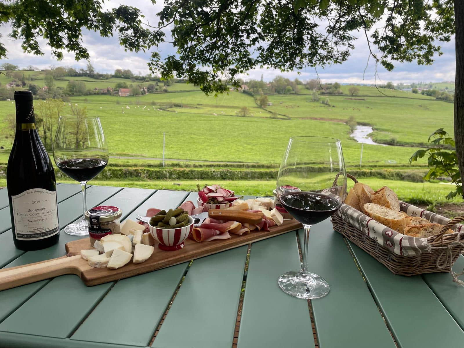 Planche de charcuterie et fromages déposée sur la terrasse de votre cabane !
