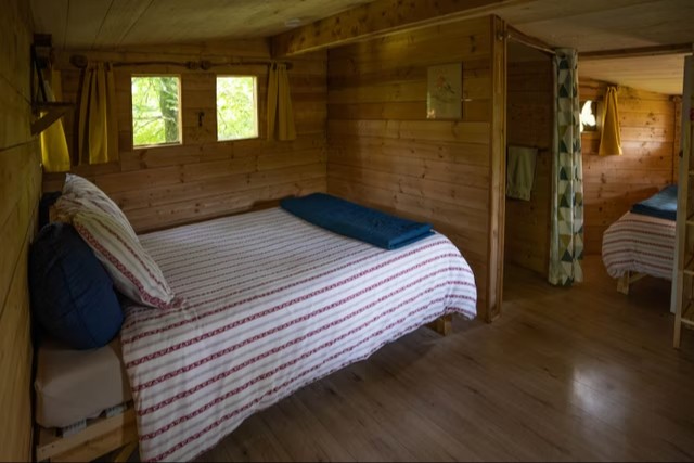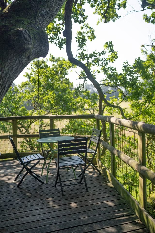 Perchée à 8 mètres de hauteur dans un chêne pluri-centenaire, la cabane Rouge-Gorge accueille jusqu’à 4 personnes pour une aventure insolite en famille, au cœur du Pays d’Auge, en Normandie. À seulement quelques minutes des stations balnéaires de la Côte Fleurie (Deauville, Trouville, Cabourg), cette cabane conviviale offre tout le confort nécessaire pour petits et grands : deux lits doubles, une terrasse aménagée, un petit-déjeuner livré le matin et la possibilité de commander un panier repas pour le soir. Une parenthèse enchantée dans un éco-domaine préservé du Calvados, où vous redeviendrez tous des enfants le temps d’un séjour inoubliable.