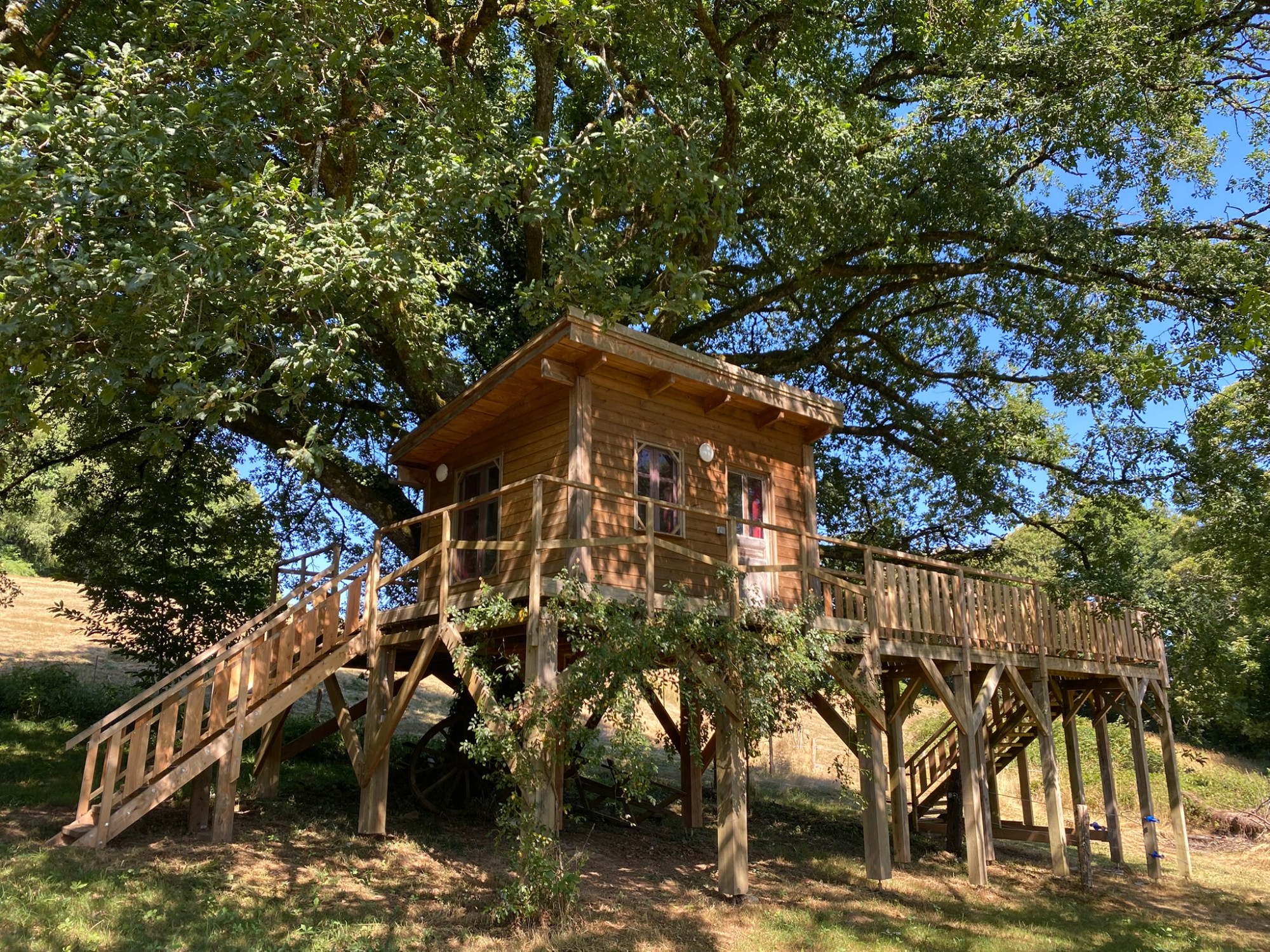 Venez vous ressourcer dans ce havre de paix, un logement unique et serein, situé à 19500 Lamongerie, en Corrèze, près du plateau de Mille Vaches. En pleine campagne, loin des regards indiscrets, le calme y règne, seulement perturbé par le chant des oiseaux et le paisible son des vaches dans les prairies. De nombreux chemins s'offrent à vous pour des balades à pied, à vélo ou même à cheval (nous avons d’ailleurs l’espace et la clôture nécessaires pour accueillir vos chevaux). À quelques kilomètres, l'étang de Masseret vous invite à profiter d'un agréable moment de baignade. La cabane, nichée sous un majestueux chêne, se compose uniquement de la chambre. Pour accéder à la salle de bain, aux toilettes et à la cuisine équipée, il vous suffira de faire quelques pas.