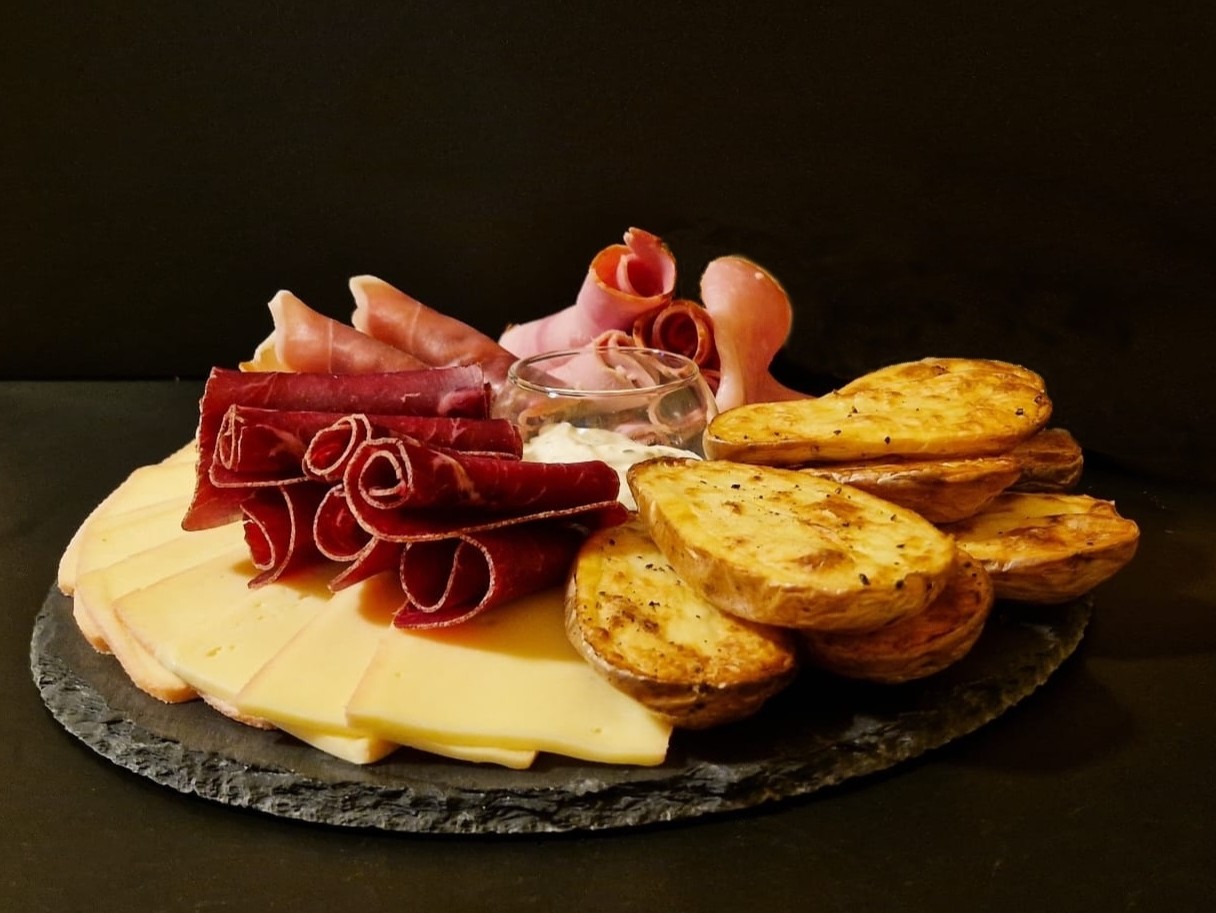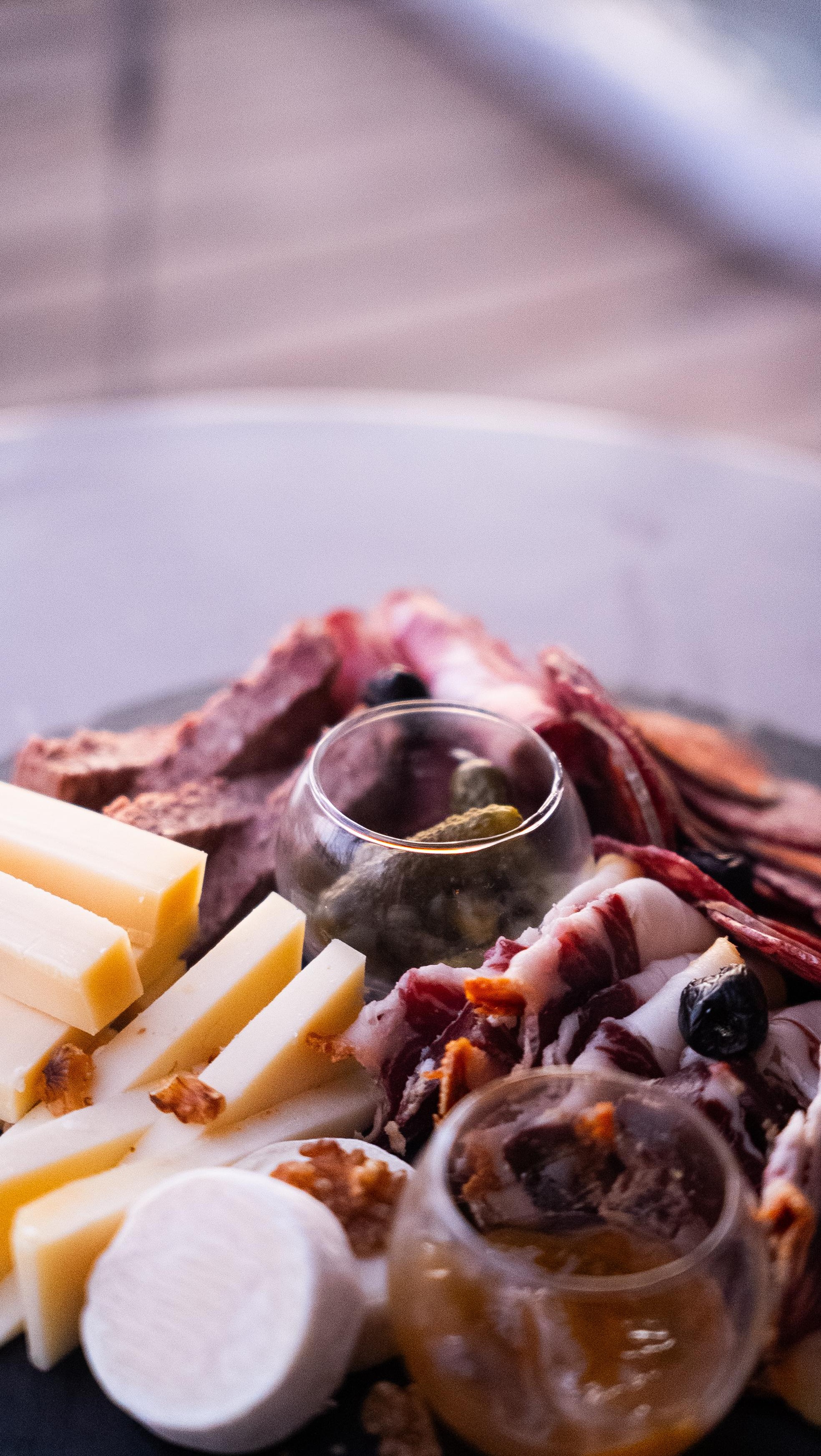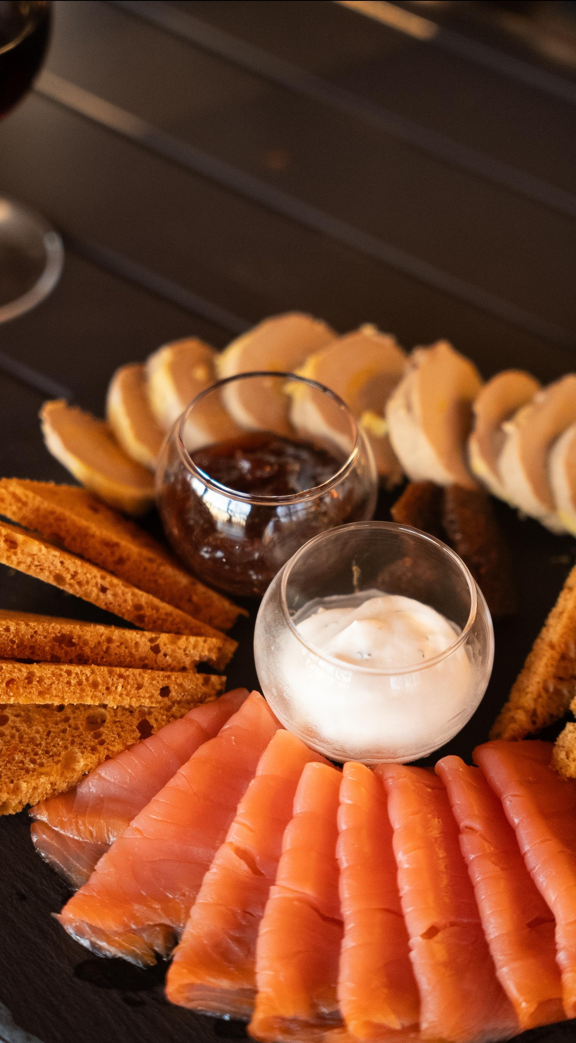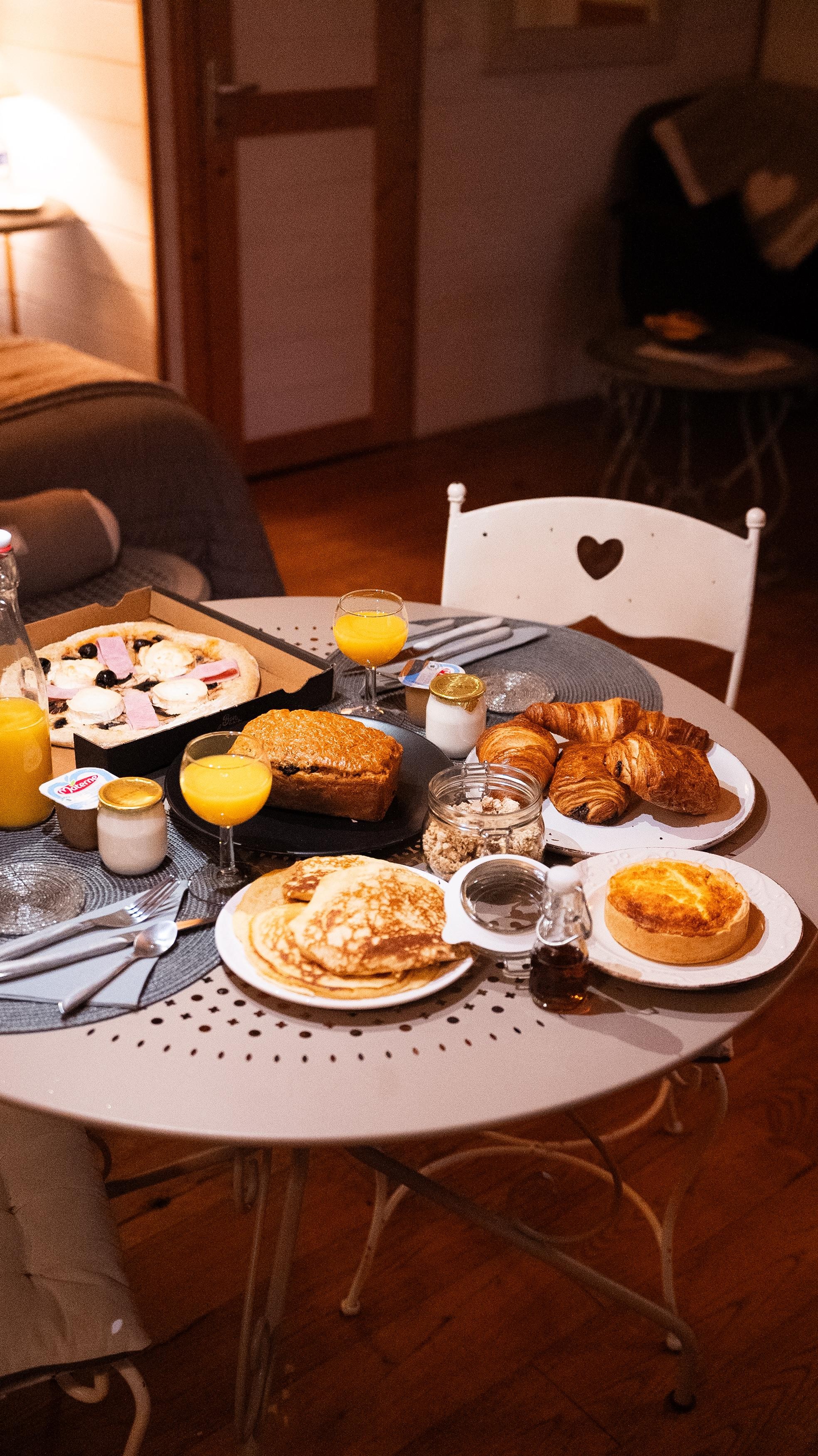 Charcuterie, fromages et foie gras, livrée directement dans votre cabane pour un repas intimiste et savoureux sans bouger de votre cocon.