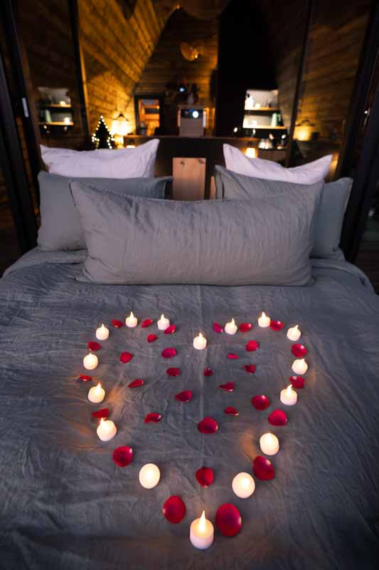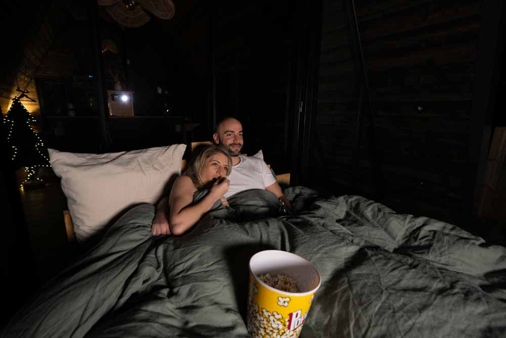 Quand la météo ne permet pas de sortir, profitez du cinéma depuis le lit grâce à l’écran pour rétroprojecteur. Avec la formule Cinéma (pop-corn et douceurs), recréez l’ambiance chaleureuse et gourmande d’une vraie séance. Un moment intime et romantique, parfait à deux, même sous la pluie.