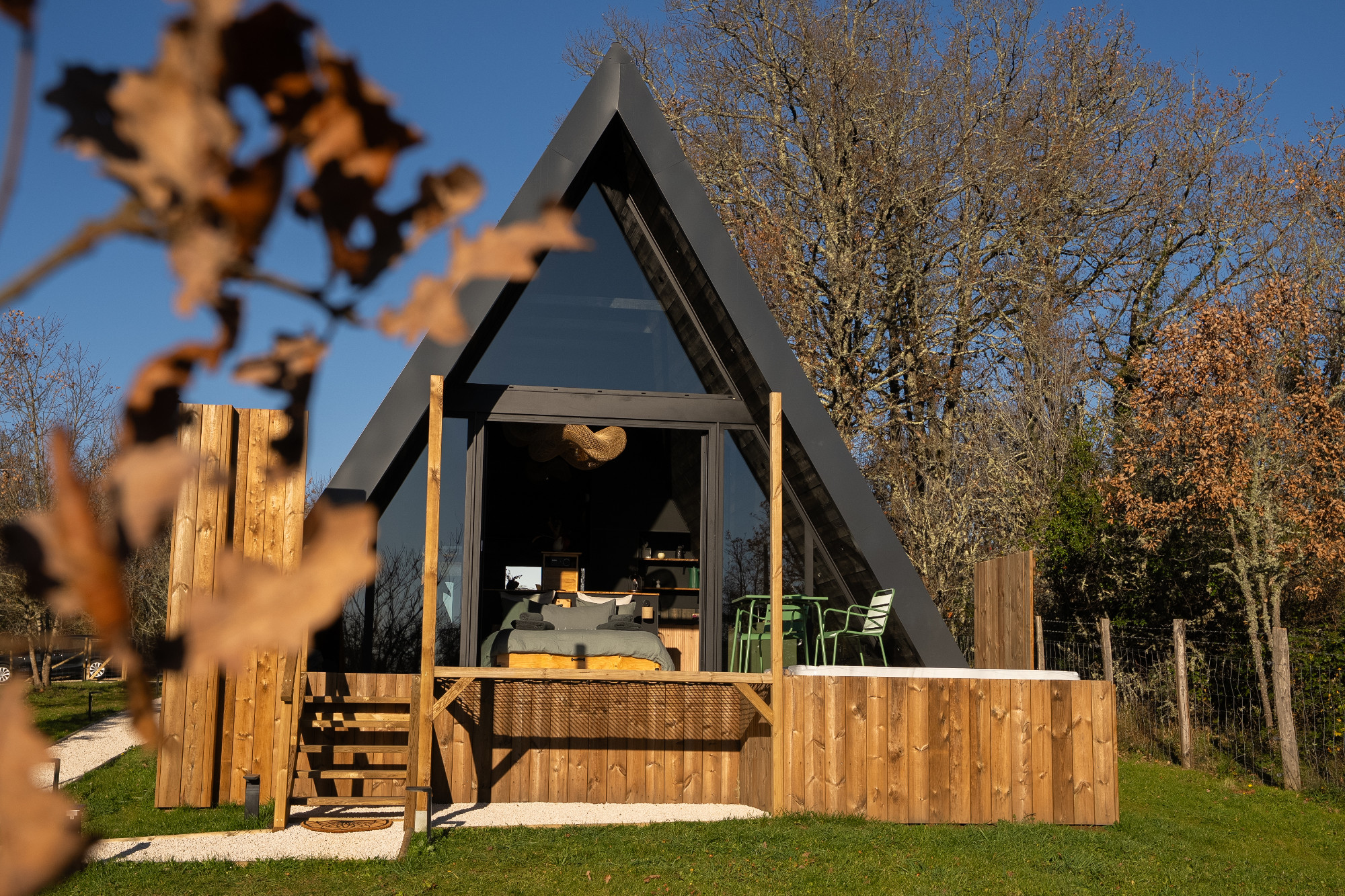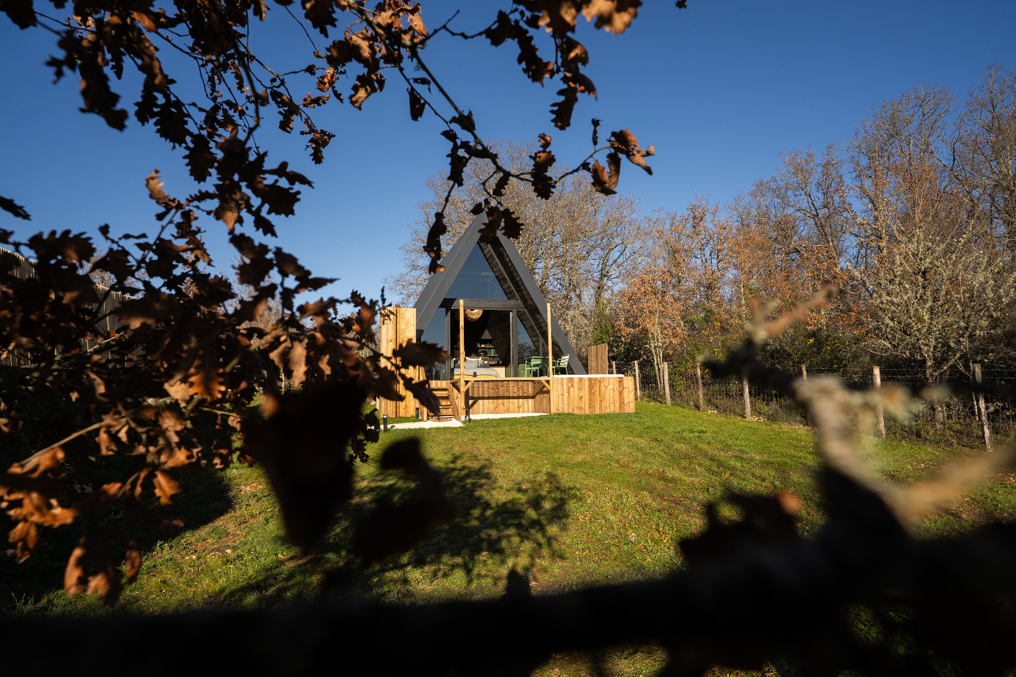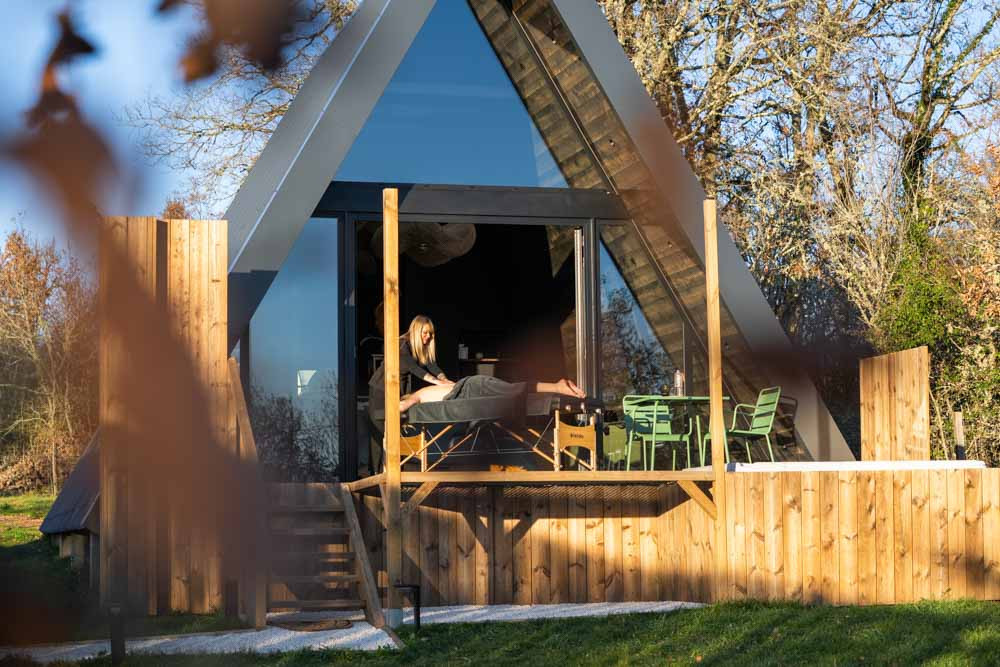 Envie d’un break unique ? À Souillac, L’Atypique est une cabane en forme de triangle, vitrée sur toute la façade, pour profiter d’une vue incroyable sur la nature et les étoiles. Les biquettes du domaine pourraient même venir vous dire bonjour ! Spa et sauna privatifs, petit-déj gourmand, et tout le confort pour un séjour cosy à deux, à deux pas de Sarlat et Rocamadour. Un cocon insolite pour se détendre, s’amuser et vivre un moment hors du temps.