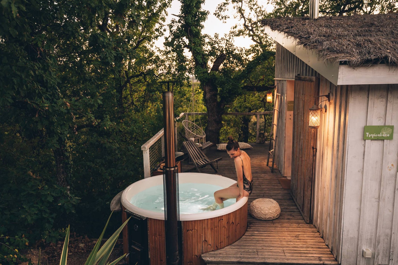 à PELLA ROCA Cabane & Spa vous ne profiterez pas que de votre cabane perchée son jacuzzi, son sauna...vous pourrez aussi la possibilité de lezarder et vous rafraichir dans la piscine du domaine pendant votre séjour. Grande piscine 12*5 chauffée et ouverte pendant la saison, un beau gazebo pour les siestes et les lectures....