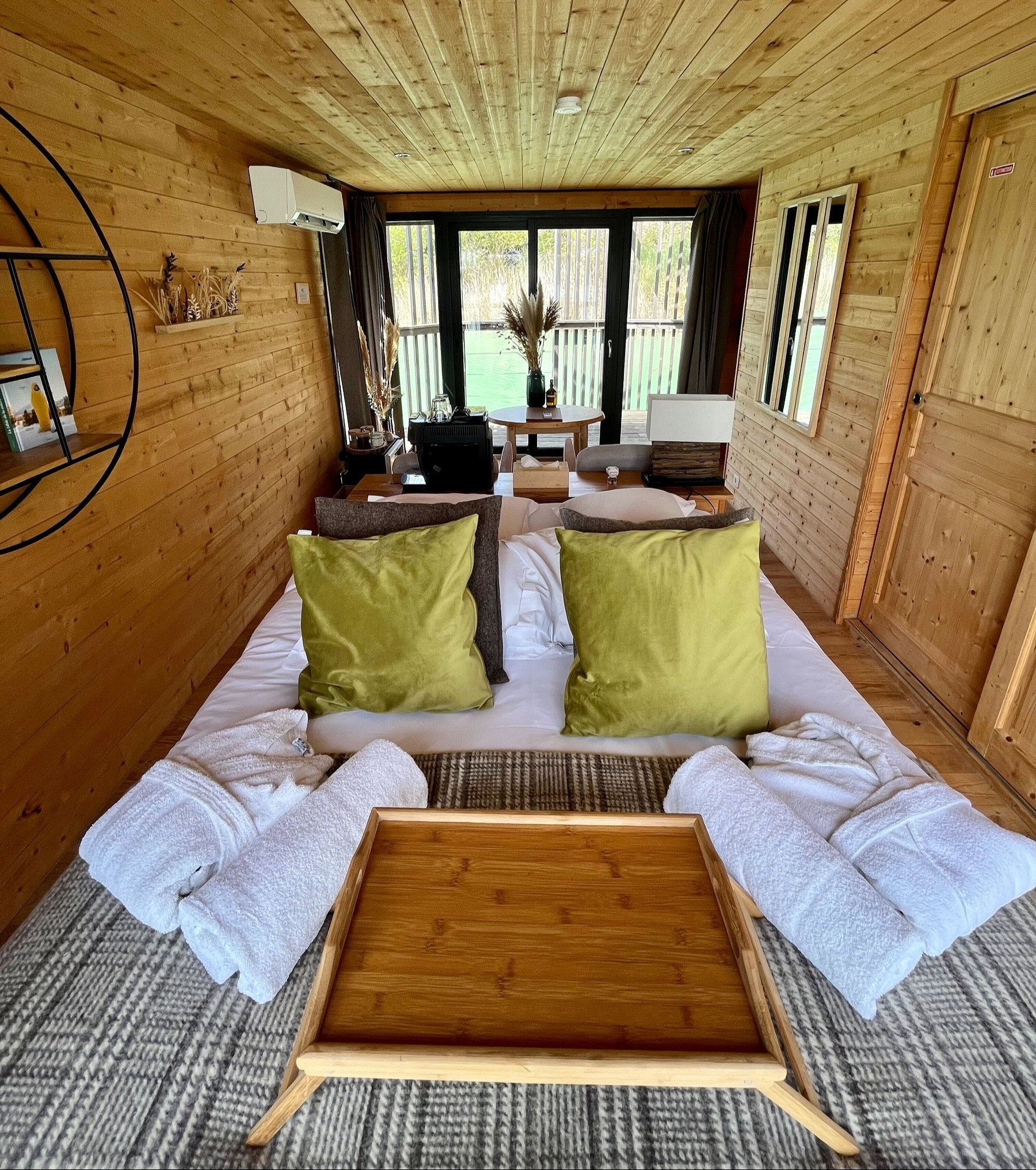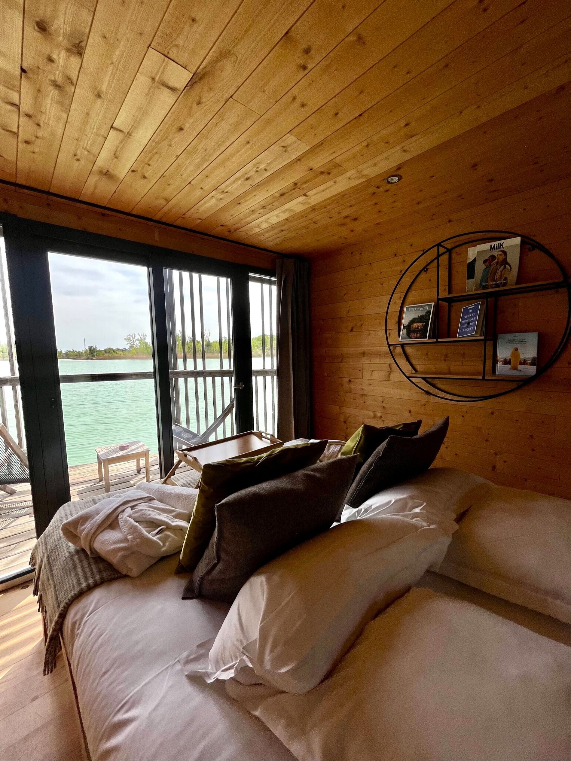 La cabane Nectar est une invitation à l'évasion et à la détente en Provence. Cette charmante cabane flottante vous promet un séjour paisible au gré des clapotis de l'eau du lac de la Lionne. Accessible par un ponton en bois enfoui parmi les roseaux, la cabane Nectar se fond parfaitement dans son environnement naturel. Imaginez-vous vous réveiller à l’aube, le levant filtrant doucement à travers les grandes baies vitrées, vous invitant à sortir sur la terrasse où le monde semble s’arrêter. Le petit déjeuner, apporté avec soin jusqu’à votre cabane, vous offrira un véritable moment cocooning avant de débuter votre journée. Le soir, après avoir exploré les richesses naturelles et culturelles des environs ou profité d’activités sur le domaine, tel qu'un atelier œnologique ou une escapade en vélo, vous pourrez savourer un dîner local sur votre terrasse, préparé à partir de produits frais et de saison. La tranquillité des lieux, rehaussée par le chant discret des oiseaux et le murmure de la nature, transforme chaque repas en un instant unique. Pour les amateurs de bien-être, la cabane Nectar offre tout le confort moderne durant votre séjour, avec un espace de vie climatisé, une salle de bain privative et un espace chambre spacieux. La grande terrasse est l'endroit idéal pour admirer le coucher du soleil tout en sirotant un verre de vin régional. En choisissant la Cabane Nectar, vous optez pour une retraite écologique et intimiste, parfaite pour se ressourcer loin de l'agitation urbaine lors d'un séjour inoubliable dans le Vaucluse.